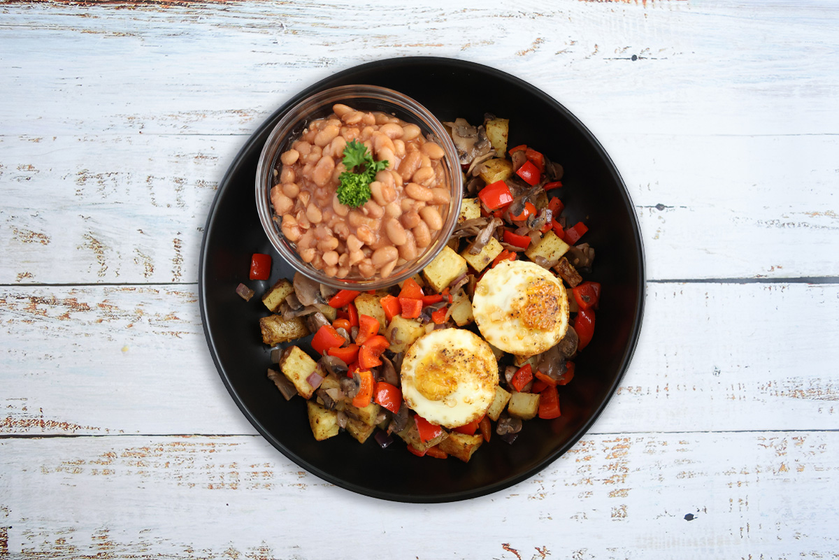 Brazilian style baked pinto beans with Spanish onion, bell pepper and herbaceous spices served over golden potato and mushroom hash with baked eggs