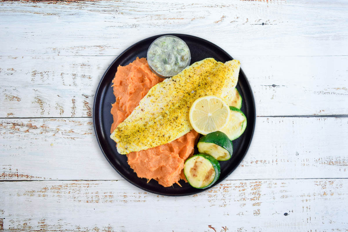 Ocean wise basa, lemon pepper seasonings, yam mash (yams, olive oil), zucchini, vegan tartar sauce (soft tofu, dill, cucumber, olive oil, pickles, lemon juice, dijon, capers), herbs & spices