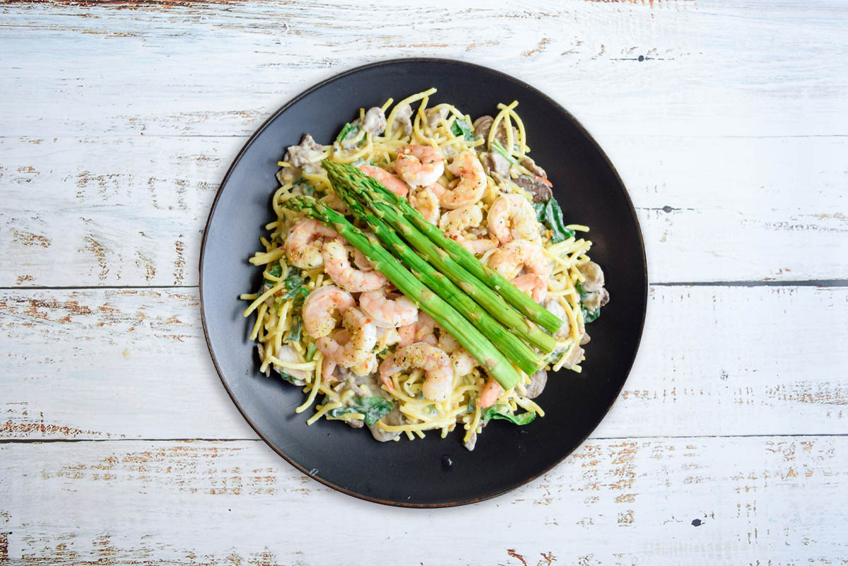 Shrimp, garlic & herb seasonings, asparagus, spinach, mushrooms, house made vegan Alfredo (coconut milk, vegan butter, garlic, house made veggie stock, black pepper, dijon, nutritional yeast, gluten free flour blend – garbanzo bean flour, potato starch, tapioca flour, white sorghum flour, fava bean flour), gluten free fettuccini pasta