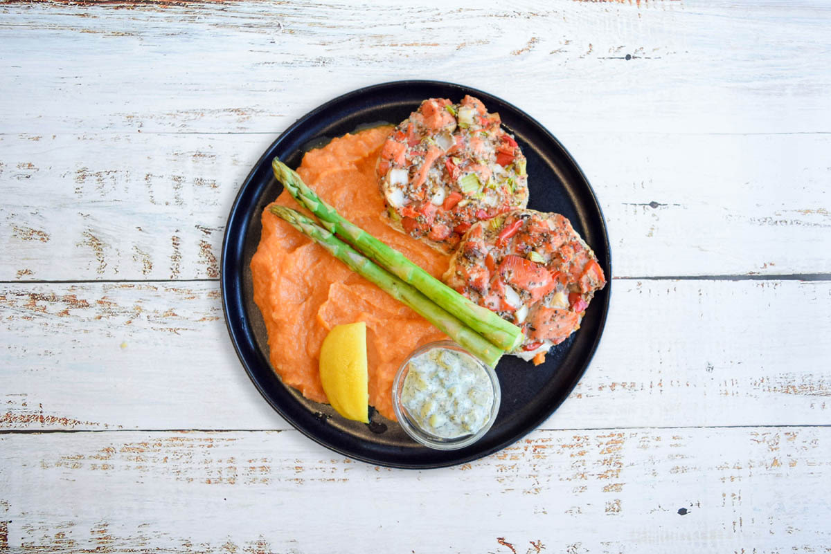 Delish Paleo Salmon Cakes made with ocean wise wild salmon, bell pepper, celery, Spanish onion, cayenne & spices served over our signature yam mash with house made vegan tartar sauce, asparagus spears & fresh lemon